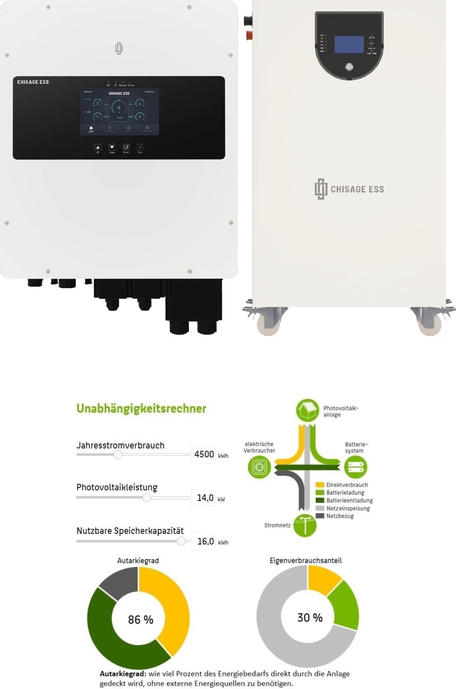 2) Chisage hybrid Wechselrichter 12KW Leistung. Lithium-Eisenphosphat-Akku, Chisage MOON16-G Pro Lithium-Eisenphosphat-Akku16 Kwh, Nach 8000 Lade- und Entladezyklen (was in der Regel etwa 20 Jahre dauert) behält der Akku immer noch ca. 75% seiner Leistung bei. Integriertes Energiemanagementsystem für Chisage-Wechselrichter und Speicher.